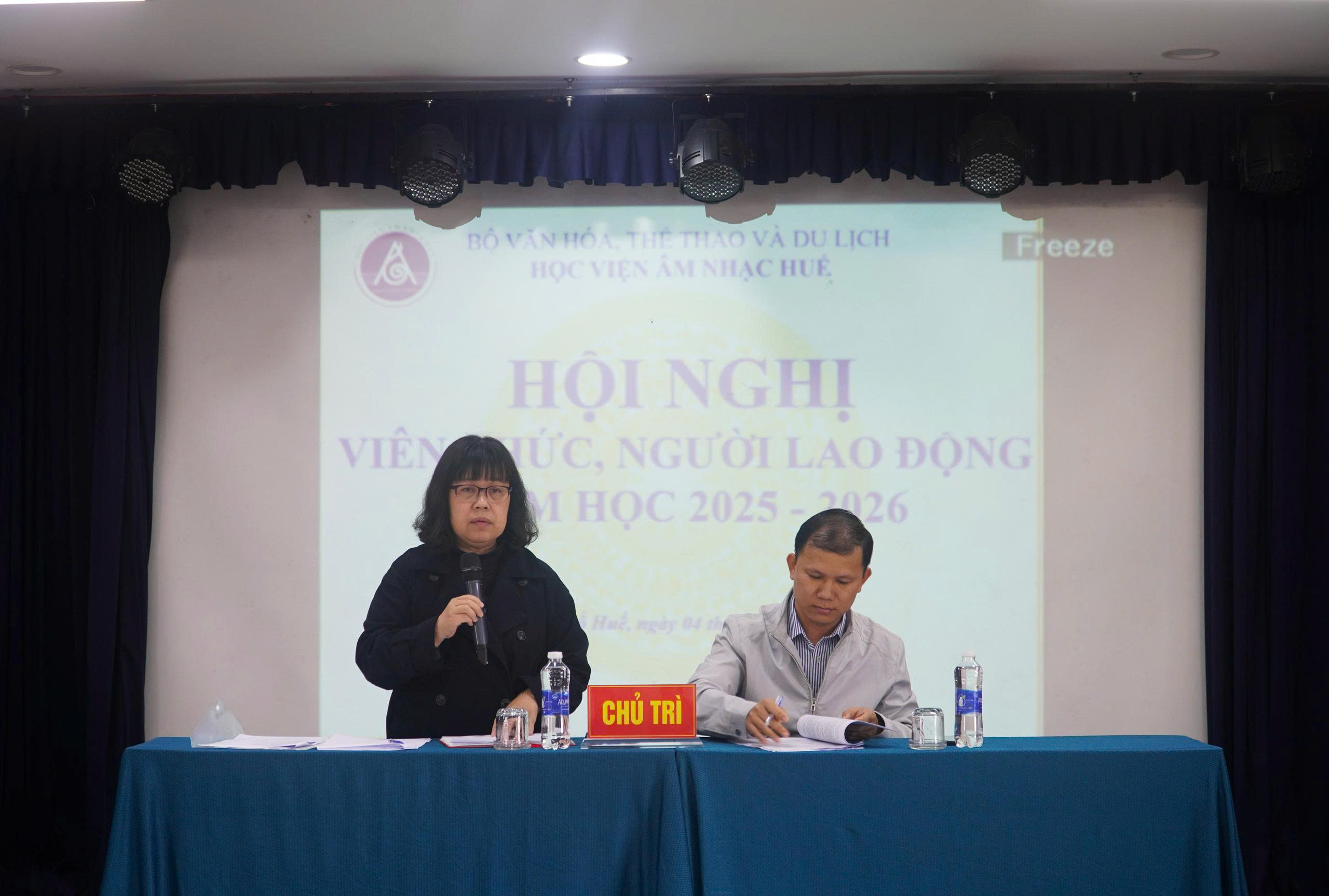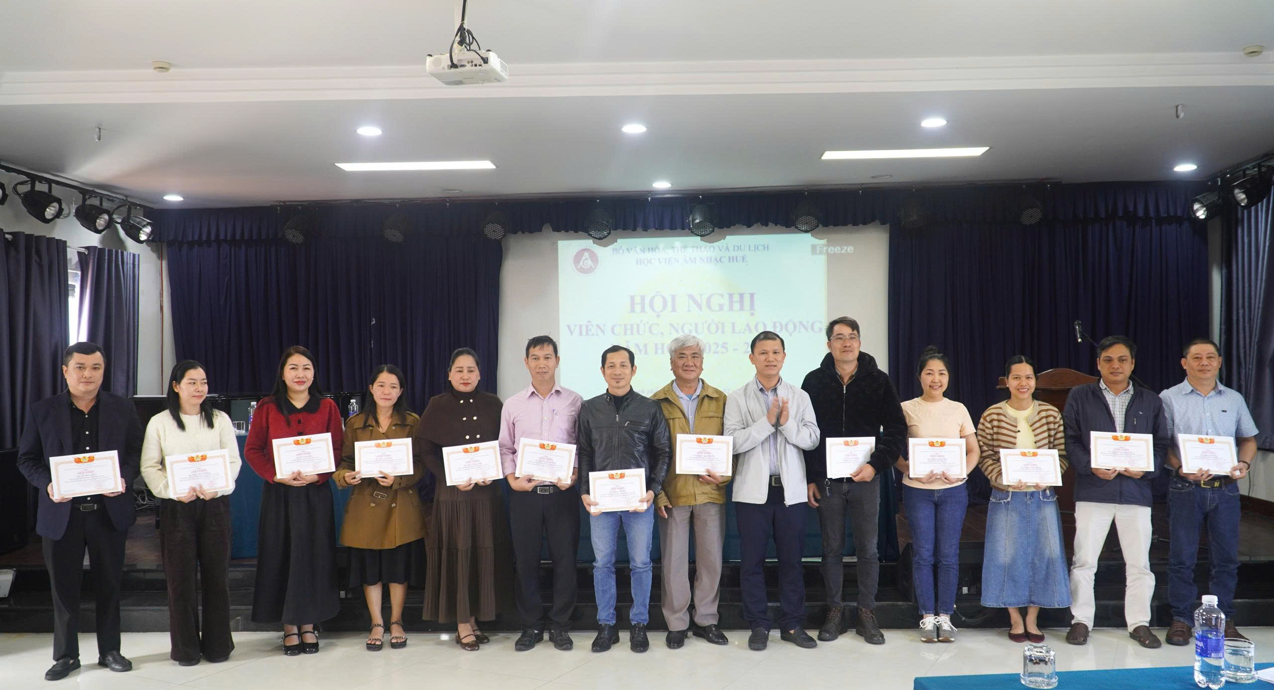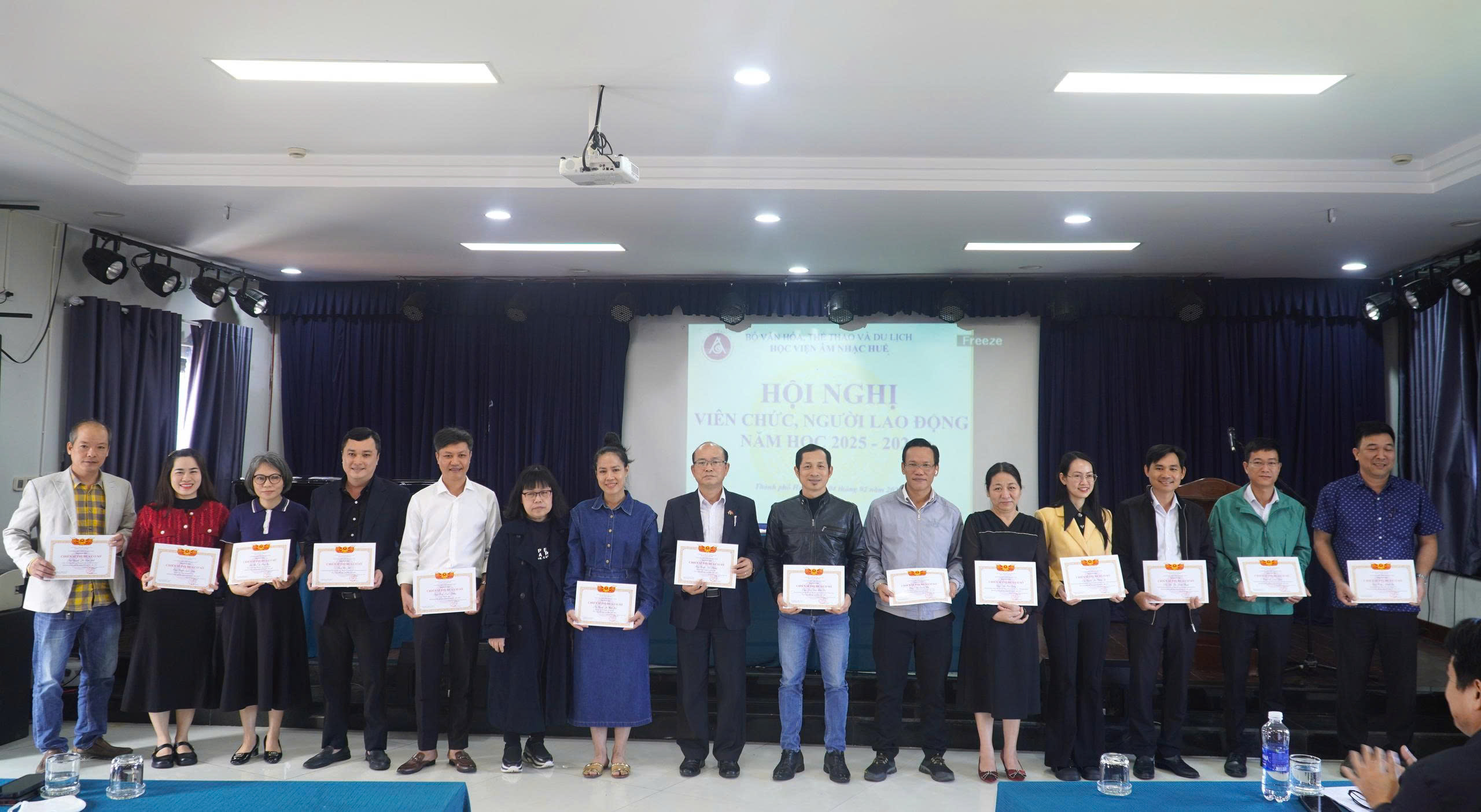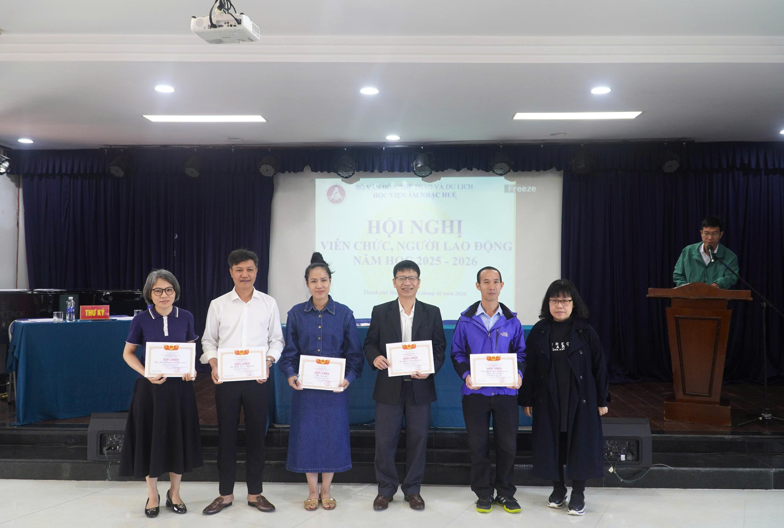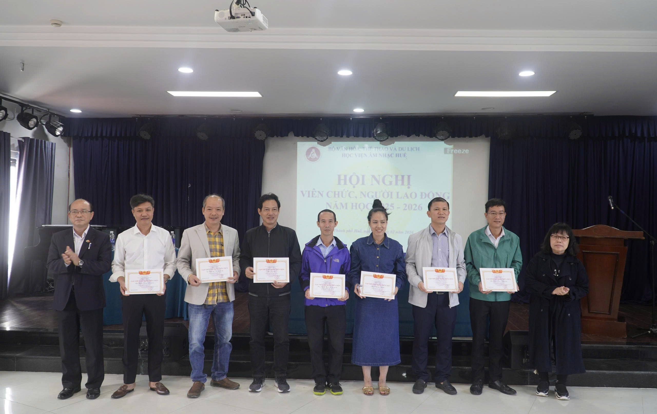 Nhằm tổng kết công tác năm 2025, đưa ra phương hướng, nhiệm vụ trọng tâm năm 2026, sáng ngày 04/02/2026, Học viện Âm nhạc Huế (Học viện) tổ chức Hội nghị viên chức, người lao động (VC, NLĐ) năm học 2025 – 2026. Tham dự Hội nghị có ông Lê Thái Thanh Tài – Phó ban Công tác Công đoàn – Liên đoàn Lao động thành phố Huế. Cùng toàn thể VC, NLĐ lao động Học viện.