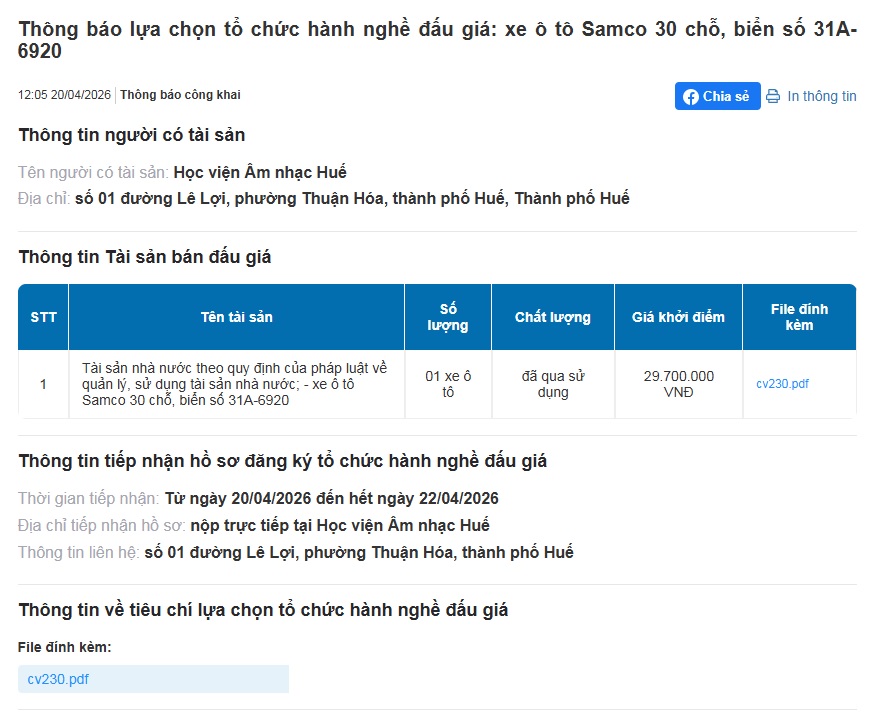 Thông báo đấu giá tài sản, xe ô tô Samco 30 chỗ. 21/04/2026
