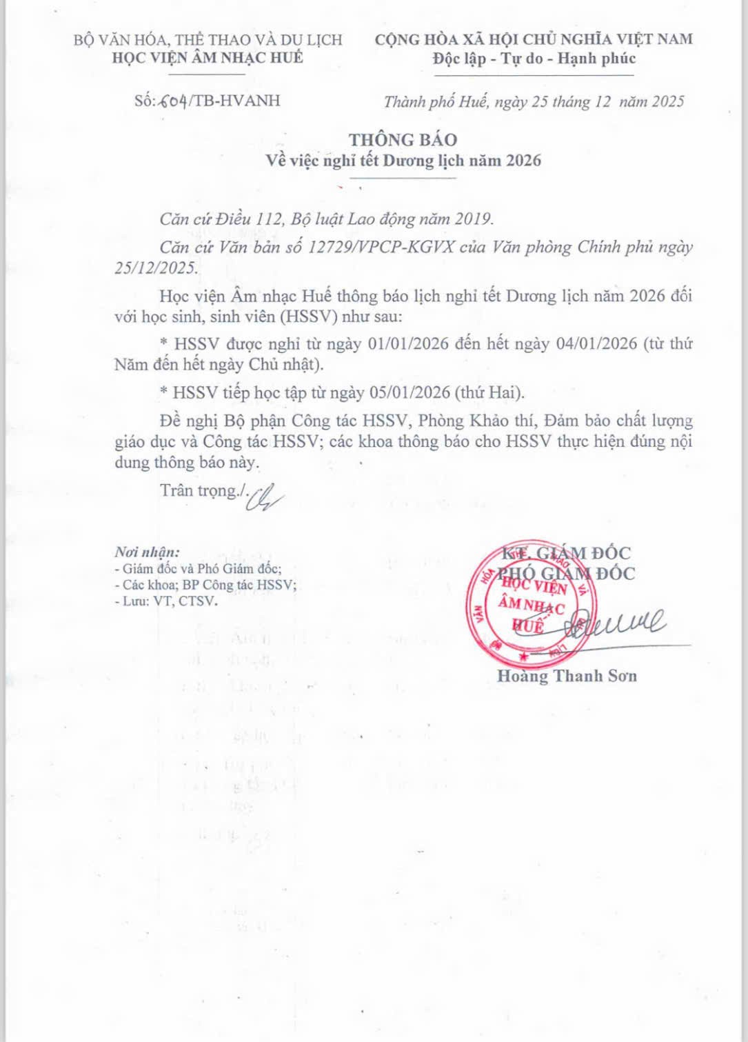 Quyết định công nhận thí sinh trúng tuyển, kỳ thi tuyển sinh Trung cấp – đợt 4 tại Học viện Âm nhạc Huế năm 2025